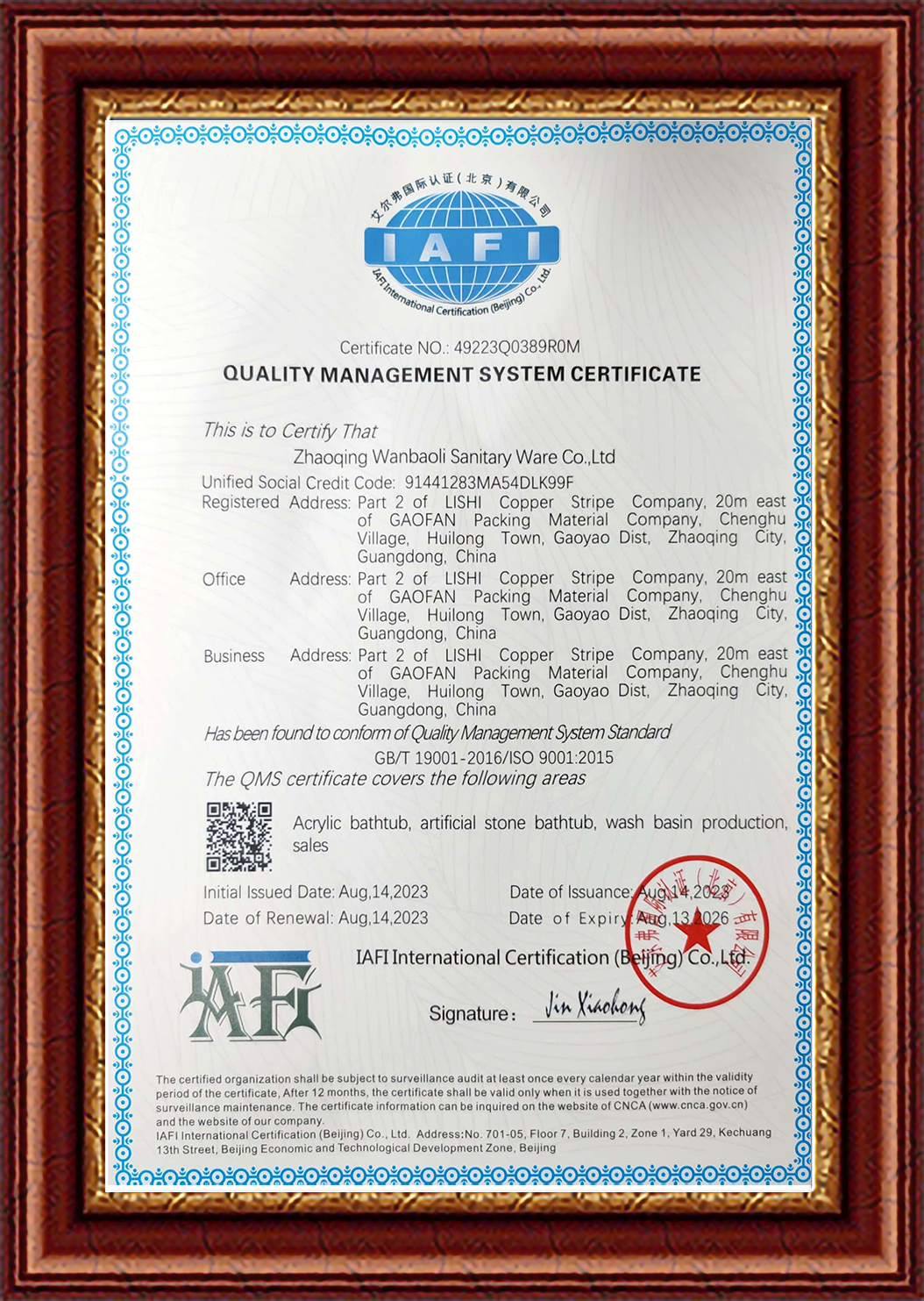 ISO9001 Quality Management System Certificate